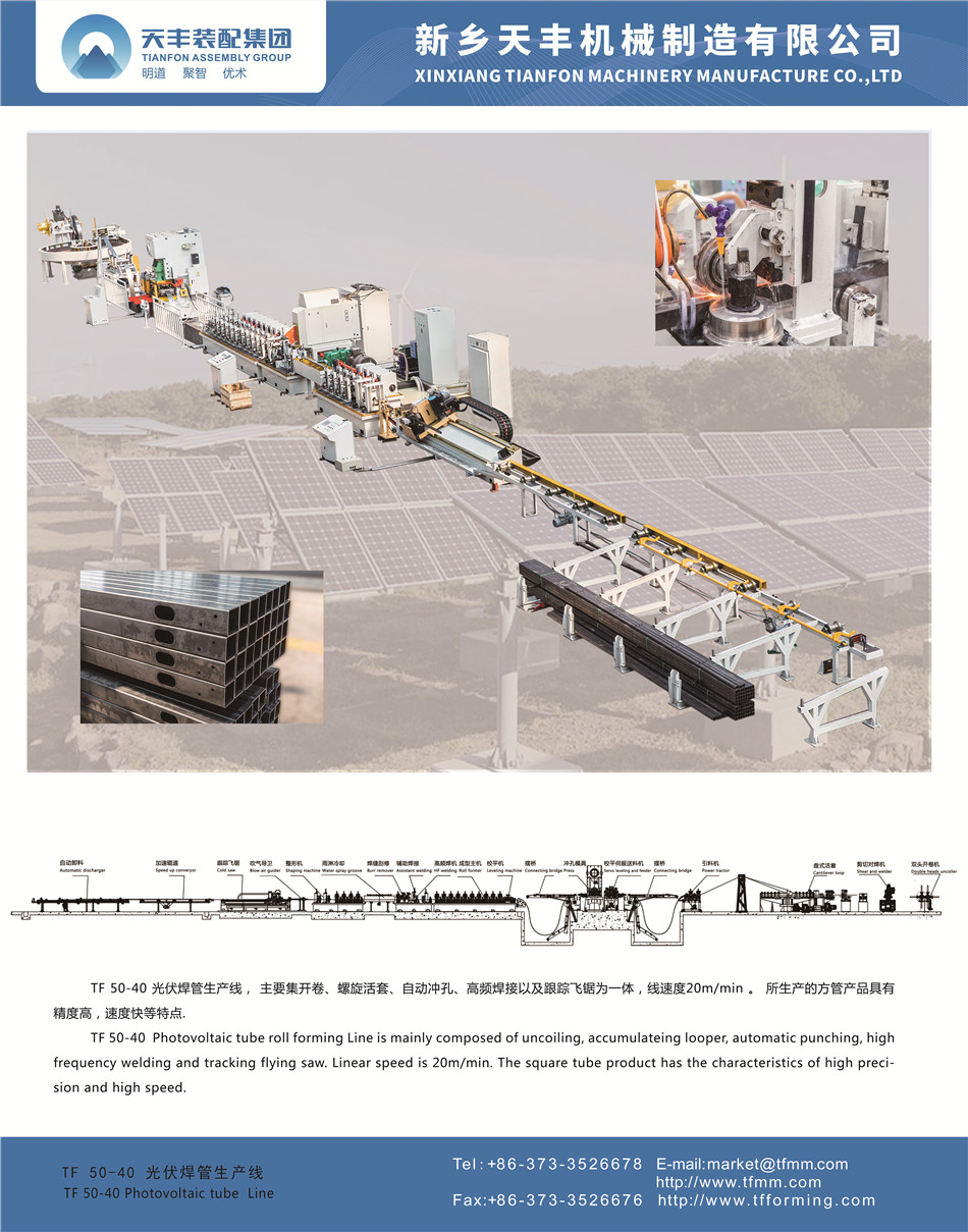 TF 50-40 Photovoltaic tube Roll Forming Line is mainly composed of uncoiling, accumulateing looper, automatic punching, high frequency welding and tracking flying saw.